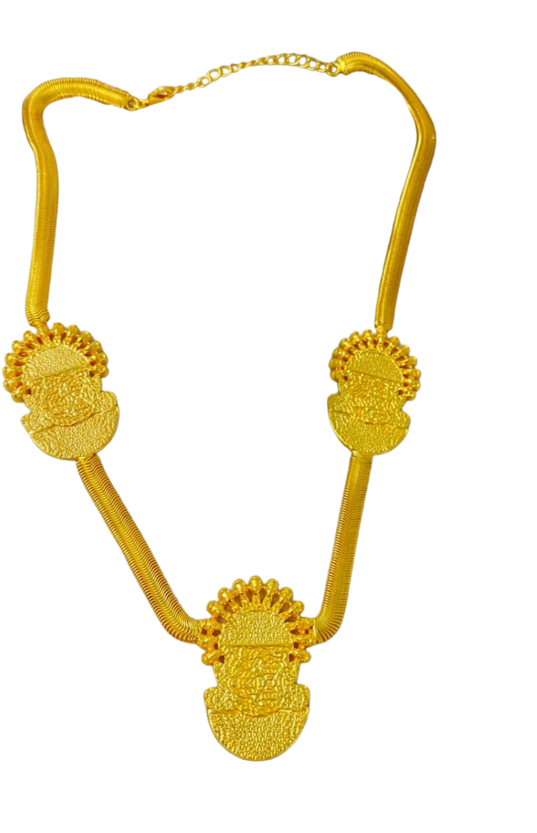 Crafted with the signature mask of the venerated Queen Idia in triplicate, the 18kt micron gold-plated necklace features the symbol in hammered gold-plated brass on a single herringbone chain.The necklace spotlights our brand's opulent and bold aesthetic. The kind of piece that elevates even the simplest outfits, pair it with a crisp white shirt for maximum impact.