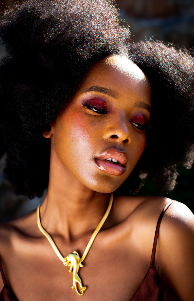 The Omolola Leopard Necklace features the leopard that is extensively represented in Bini royal art. and iconography Crafted from 18k micron plated brass, the stylised leopard dangles from a herringbone chain . Designed to sit just below the collarbone, wear yours with a crisp white shirt for major power appeal.